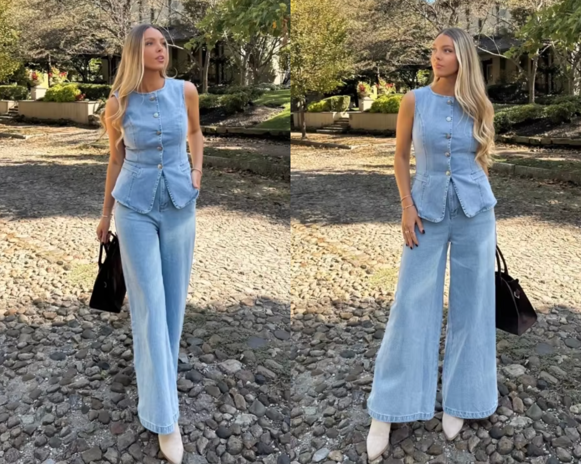 Elevate your everyday style with the Gabbi Denim Set—a chic pairing designed for the fashion-forward woman. Crafted from premium structured denim with sleek silver-tone accents, this top and wide-leg combo effortlessly blends sophistication with comfort. The flattering wide-leg silhouette and timeless four-pocket design ensure both elegance and versatility. Perfect for brunch dates or city strolls, this set is your go-to for polished, head-turning looks.