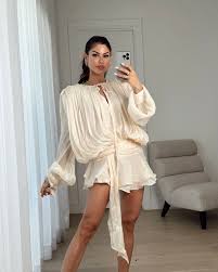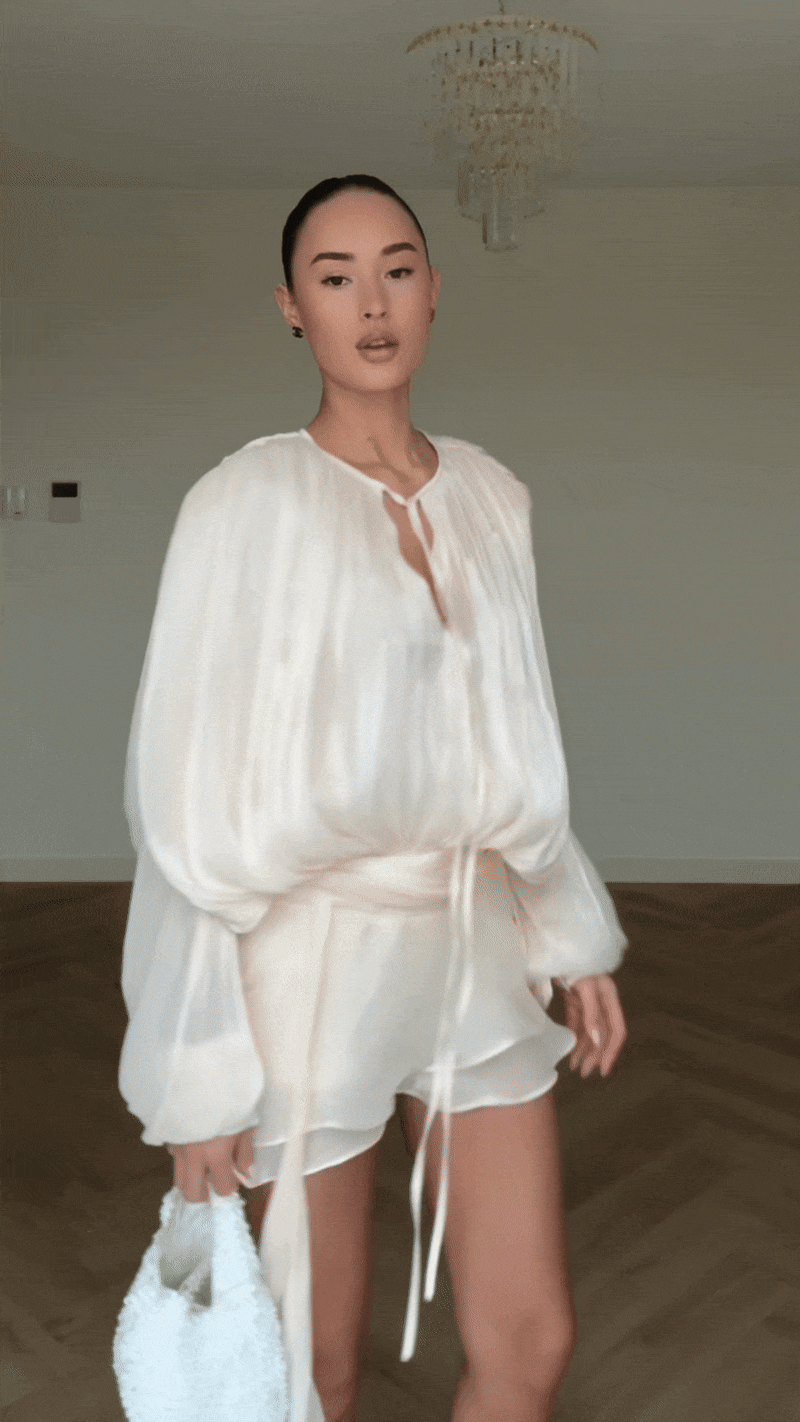 The apricot color glows in golden hour! Felt elegant yet playful—perfect for summer dates. The ruffled cuffs are such a cute detail!